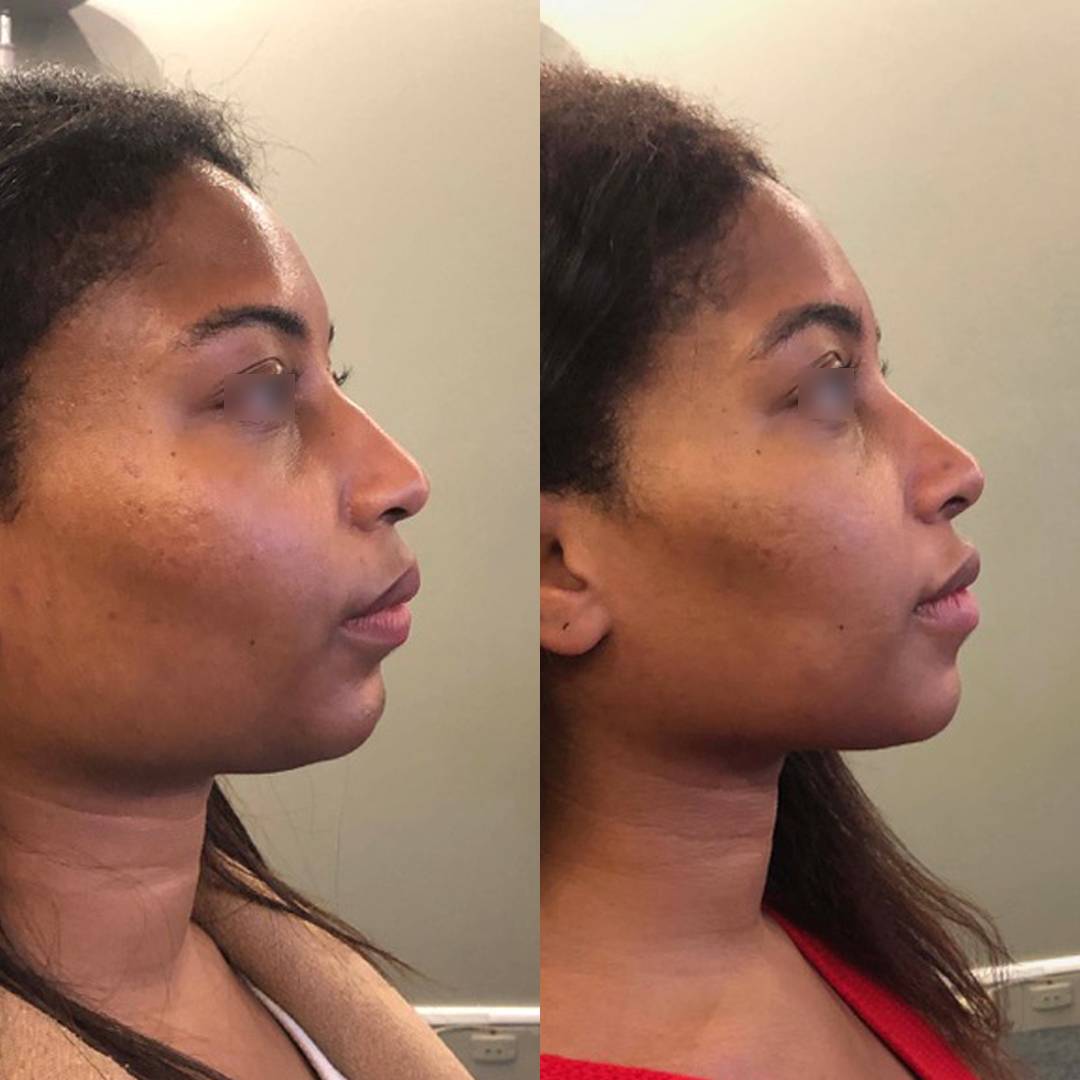 La rhinoplastie ethnique est large sujet , de nombreux chirurgiens proposent toujours la meme technique de prélèvement costal et d'une reconstruction excessive , tout d'abord la couleur de la peau n'est pas spécifique d'une forme de nez et d'un qualité de peau , sur l'exemple que je présente la patiente a une peau intermédiaire ni fine ni épaisse , elle présente un nez large , une pointe ronde et une bosse et un manque de projection , aussi dans ce cas trés peu de greffes cartilagineuse sont nécéssaires , dans d'autres cas le plus souvent et afin de conserver un aspect féminin de profil , seule une augmentation de projection et un affinement de la pointe associes a une reduction des ailes narinaires permettront d'offrir un bon résultat et cela juste avec du cartilage d'oreille sans prélèvement costal