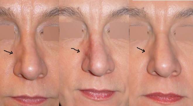 près réalisation d'une rhinoplastie chirurgicale Meme si le produit est résorbable , l'expérience montre que la répétition des injections permet de créer un tissus cicatriciel qui a terme comble les imperfections .